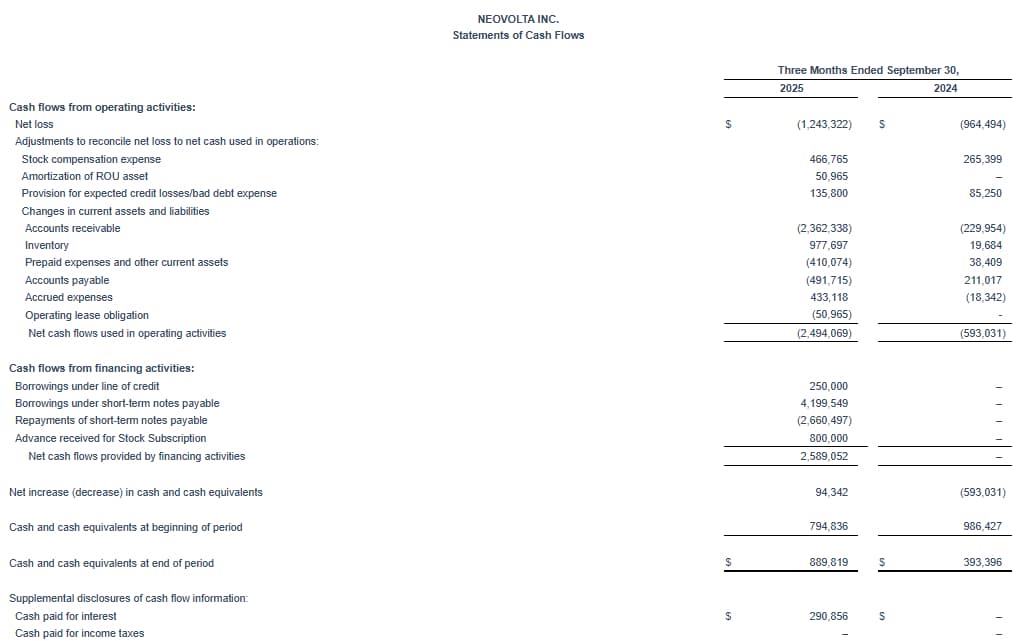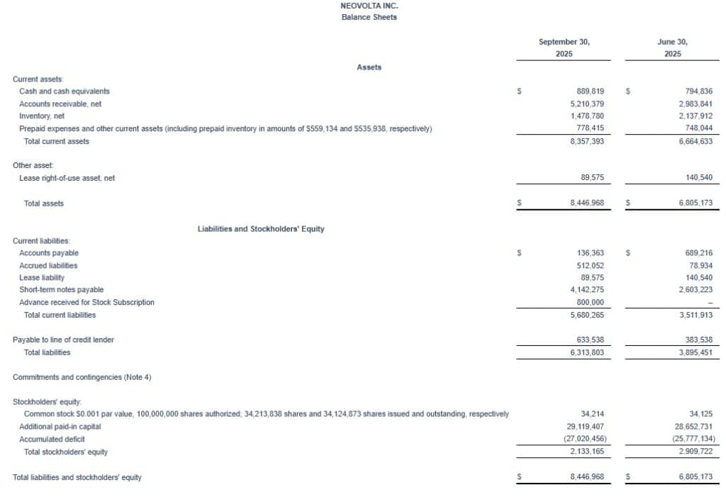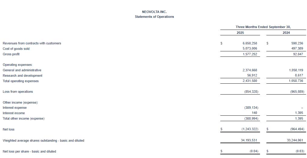 NeoVolta Inc. (NASDAQ:NEOV), a U.S.-based energy technology company delivering scalable storage, for resilient residential and commercial power infrastructure, today announced financial results for its first quarter of fiscal 2026, which ended September 30, 2025.