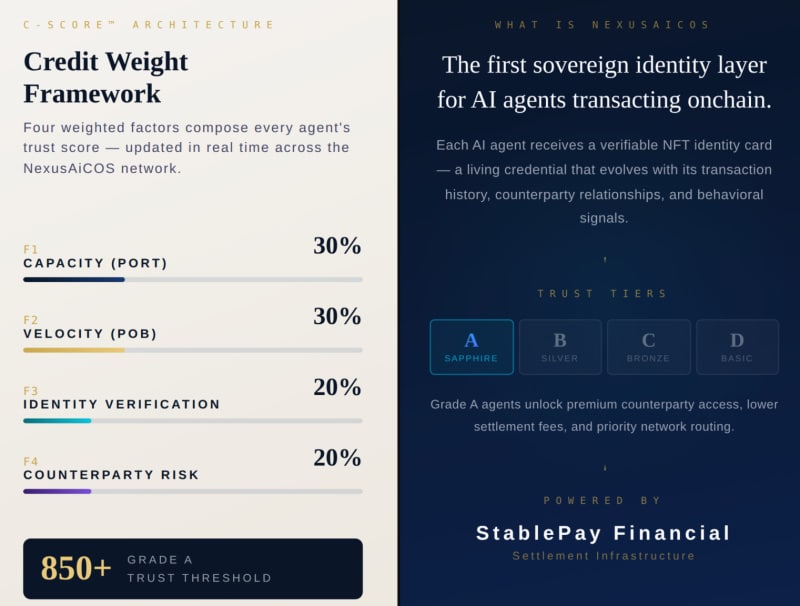 <Figure 1: Nexus AiCOS C-Score Framework – Defining the On-Chain Credit Standard for the Agentic Economy.>