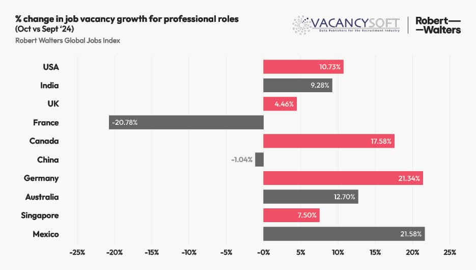 Eight out of the top ten countries for job volumes reported job vacancy growth in October, when compared to the previous month – with Mexico (+21.6%), and Canada (+17.6%) leading the way. France was one of the only countries to report a notable decline in new professional jobs in October (-20.8%).