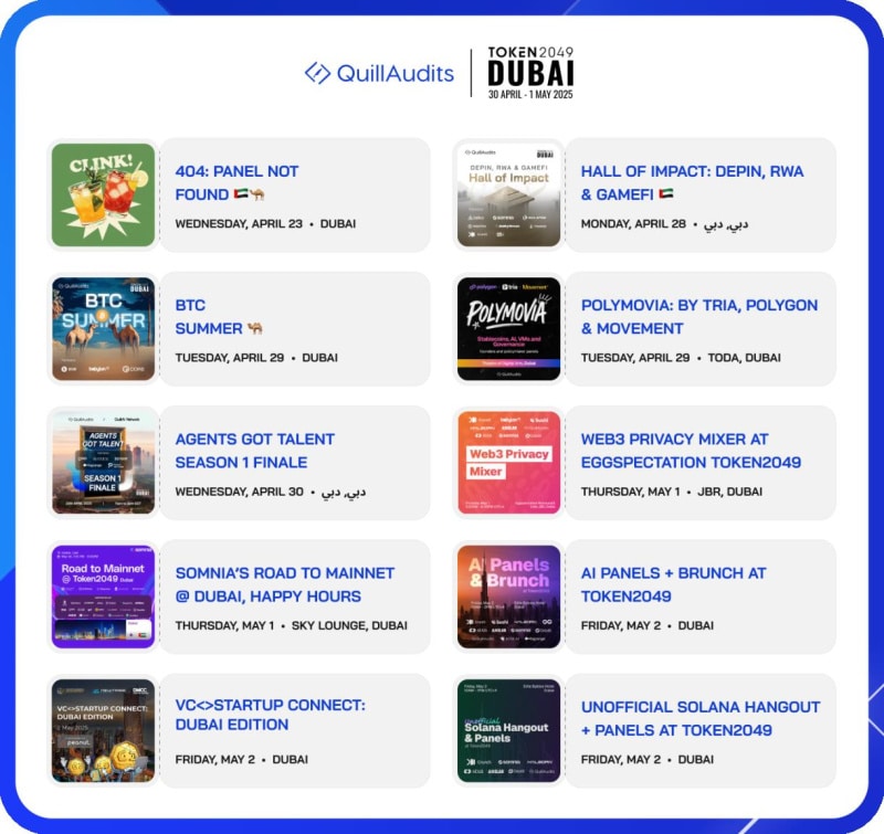QuillAudits, a leading Web3 security auditing firm, is proud to announce a curated lineup of four exclusive events taking place in Dubai this April and May. Strategically organized around TOKEN2049 Dubai, these gatherings are designed to bring together professionals in blockchain, DeFi, GameFi, Bitcoin, and AI to foster collaboration and dialogue on the future of Web3.