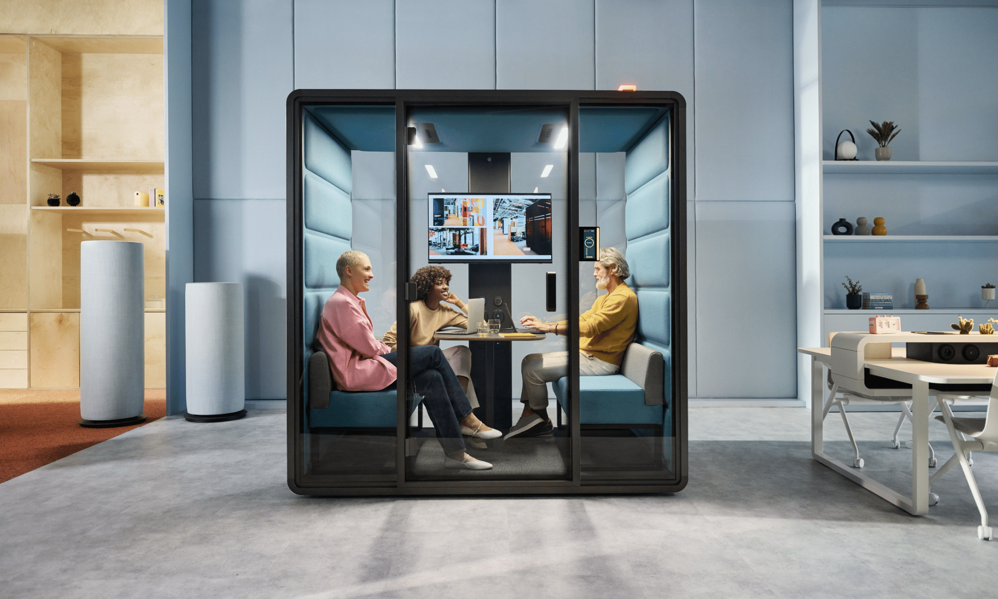 Ensuring the office has quiet areas or relaxation zones where employees can take a rest not distracted by screens is always a good idea. These breaks regenerate the mind, while potentially promoting interaction in the office, which can stop the ICT work-induced feeling of isolation. Companies, even small ones, can find it worthwhile to create tech-free zones, for example using the hushFree.L acoustic pods for 4-6 people. The cabin can be fitted with suitable tables, sofas or additional coffee tables for the purpose of relaxation. The pods are specifically designed so that you can cut off devices with all incoming notifications, and even the excess sound from the open space.